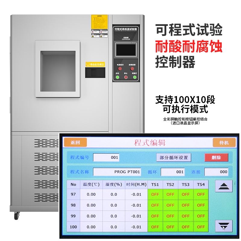 试验箱标准配置观察窗:透明电热膜中空钢化玻璃1个(位于门上),引线孔:φ50mm 1个(位于箱体左侧),门上备室内照明灯(高效长寿节能灯),移动脚轮:4个、样品架:不锈钢样品架1层,挂钩4个,承重(均布):25kg/层 (箱内样品累计总承载不超过:100kg)